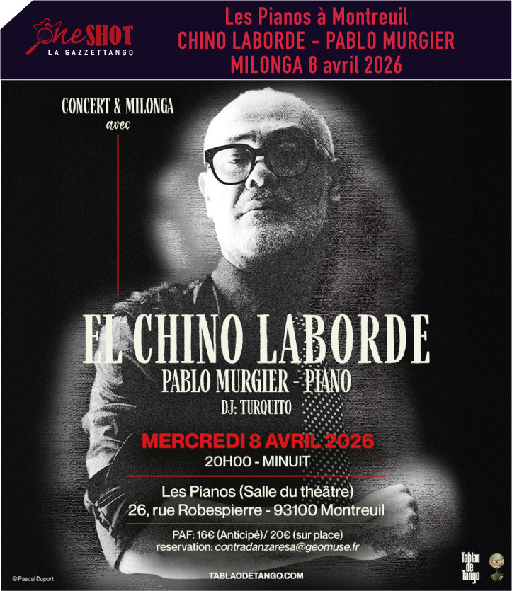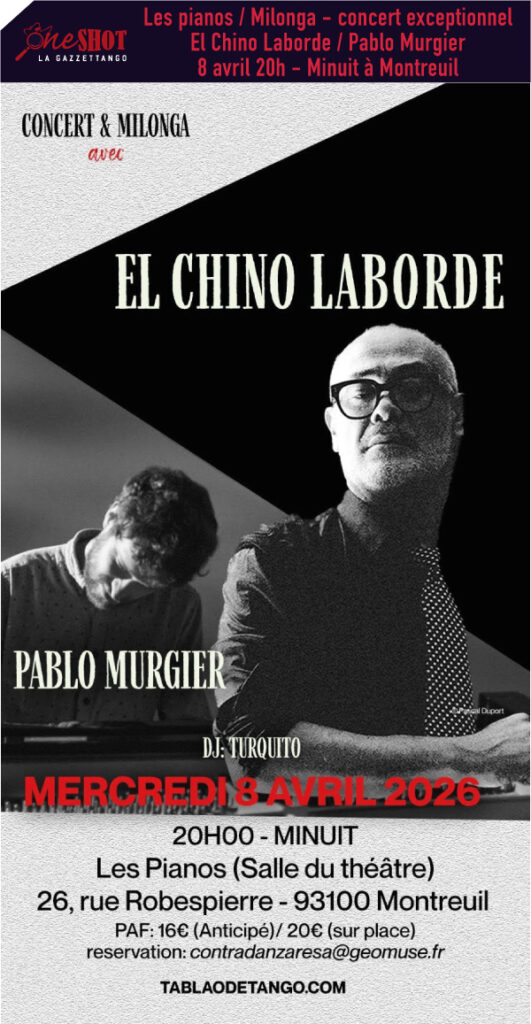 Chino Laborde, aura l’honneur d’être accompagné par Pablo Murgier, (en remplacement de Roger Helou initialement prévu) : ce pianiste, hyper créatif, grand soliste par ailleurs, vient de sortir un très bel album « Sirocco ». Il a le gout de l’improvisation, du tango et des suspensions intimes. Il était présent à la Création du Tablao de tango en 2022, à la Philharmonie de Paris, avec Chino Laborde : ils se retrouveront pour la première fois depuis… Grande soirée en perspective !